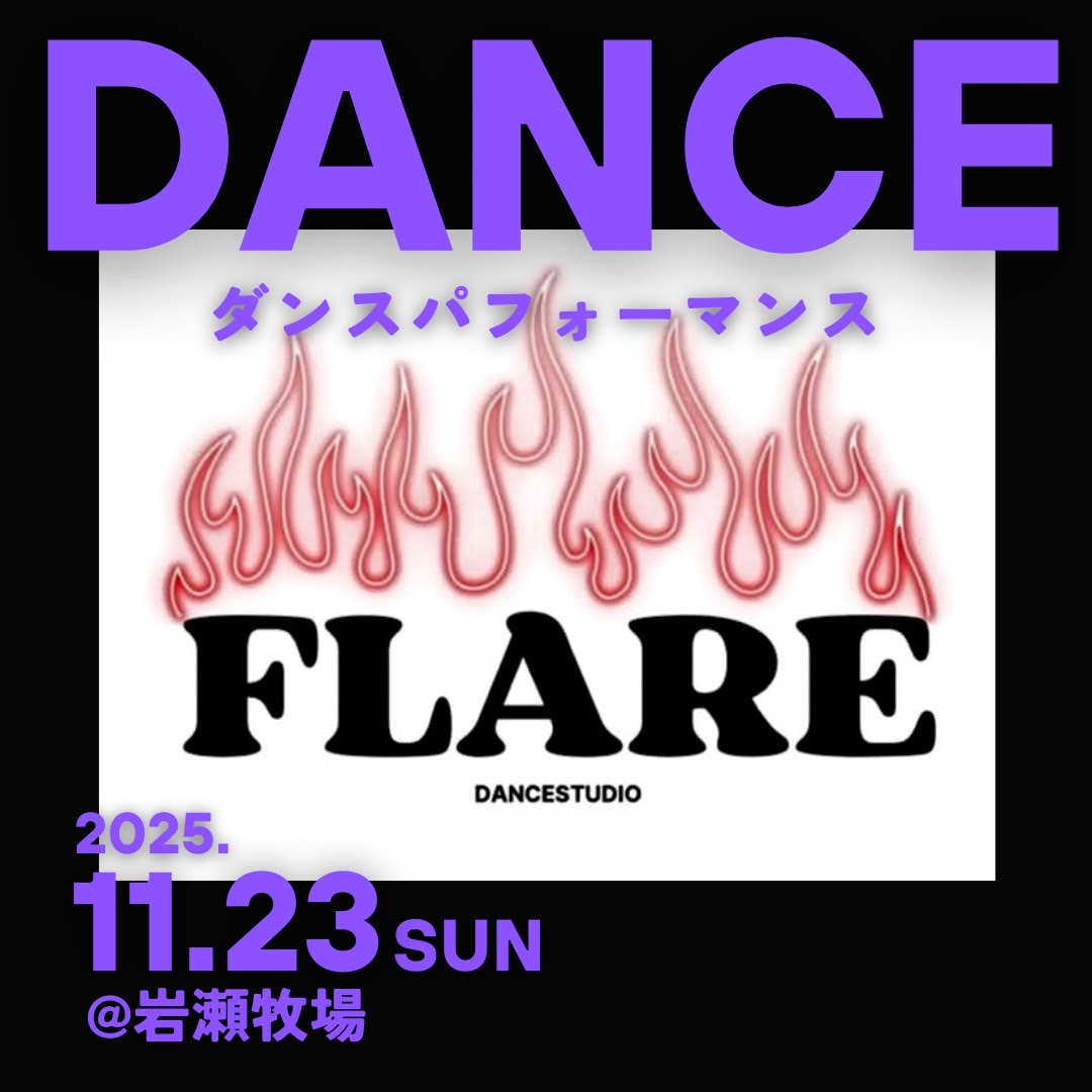 岩瀬牧場です‼️11月23日(日)に「フレアダンススタジオ」の皆様による、ダンスパフォーマンスを開催いたします🙌時間は10時~スタート‼️当日は一般のお客様もご覧いただけます👍これからダンスをはじめたいと思っているお子様やもちろん大人のかた‼️なおのこと必見です👍また3連休、牧場にご来場予定の方も‼️ぜひとも皆様お誘いあわせの上、ご来場くださいませ🙌🙌🙌