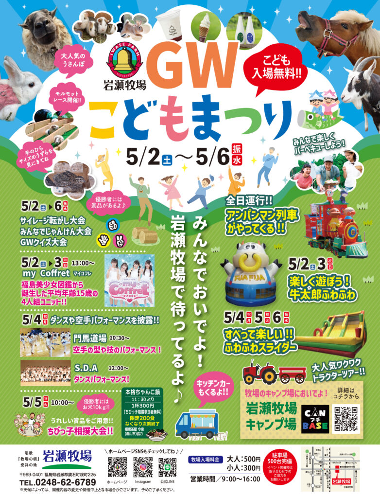 HOME INFORMATION 食べる 動物 遊ぶ 花 お知らせ INFORMATION 2026GWこどもまつり開催‼️‼️ EVENT 2026.04.28 今年も開催‼️こどもまつり😆GWは岩瀬牧場でお待ちしております👍連日、おもしろ企画が目白押し☀️大人気のちびっこ相撲🤗も開催いたします!まだまだエントリー受付中🙌岩瀬牧場サイレージ転がし大会は当日エントリー受付といたします😸連日開催しておりますので、皆様のご参加をお待ちしております‼️‼️ 戻る