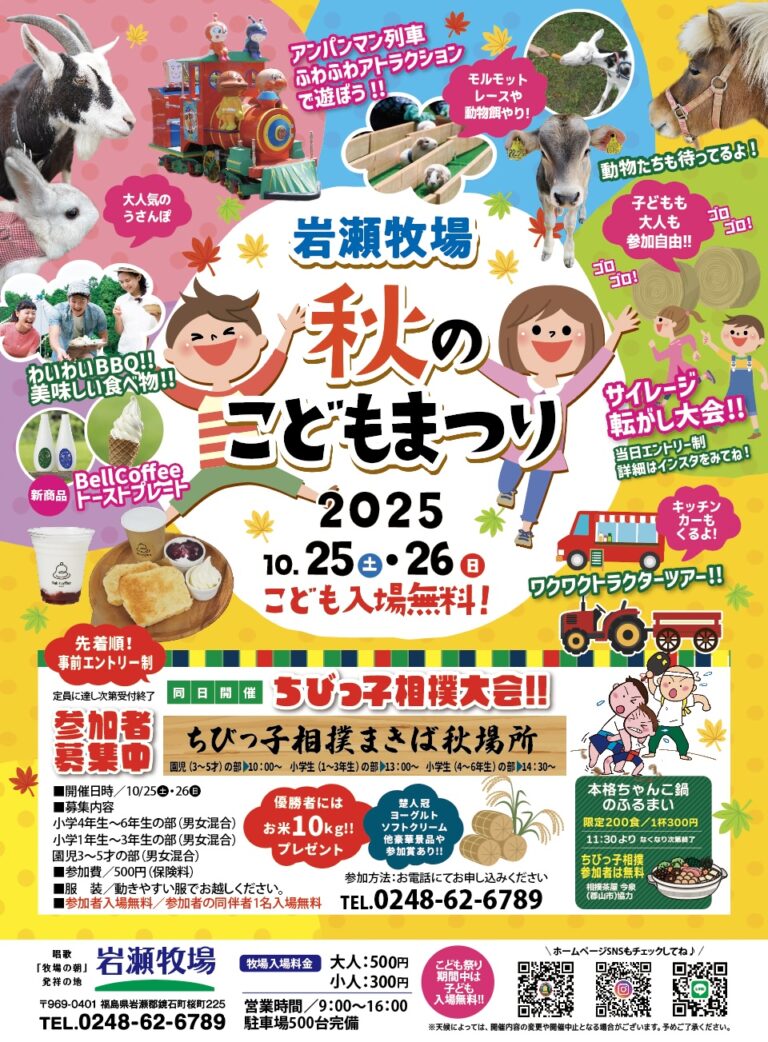 HOME INFORMATION 食べる 動物 遊ぶ 花 お知らせ INFORMATION EVENT 秋のこどもまつり、開催!! 2025.10.19 NEWS フタバワールド2025に岩瀬牧場が出張します‼️ 2025.10.07 EVENT 岩瀬牧場初のドッグイベント「わんダフルフェス」開催‼️ 2025.10.07 EVENT ふくしまキッズトレイルラン 岩瀬牧場大会開催! 2025.09.21 EVENT トウモロコシ迷路グランドオープン! 2025.07.17 EVENT 6.29!無料開放DAY!岩瀬牧場へ集合! 2025.06.10 EVENT 岩瀬牧場フラワーフェスティバル開催!! 2025.05.20 EVENT 2025GWこどもまつり開催! 2025.04.29
